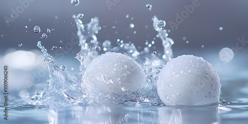 White spherical objects gently floating in water, creating droplets and bubbles. High-speed photography captures the ethereal atmosphere in a minimalist aesthetic.
