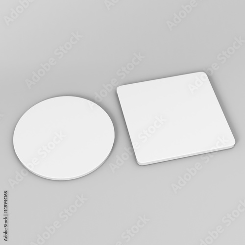 White Square and round circular coasters on isolated grey background, 3D Illustration