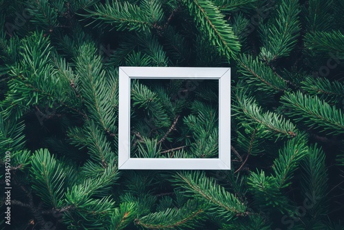 White square frame on green pine branches, elegant and minimalist composition, lush evergreen background.