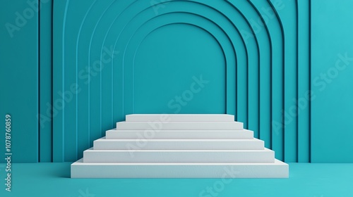 White steps on a blue background with a row of arches creating a futuristic backdrop.