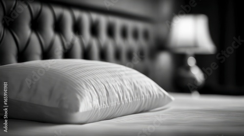 White striped pillow on a bed with a tufted headboard and blurred lamp