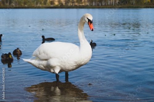 White swan stands in the lake