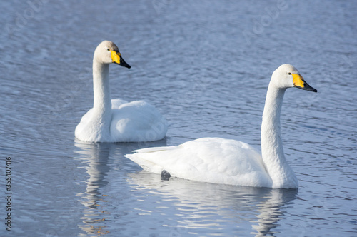 White swans swimming in the nonfreezing winter lake
