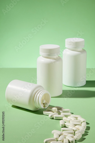 White tablets from white unlabeled drug jar spilled as a line on the green table, in back of it is two mockup medicine bottles standing by side. Front angle shot, promotional space