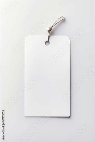 White tag with metal clip on it on white background.