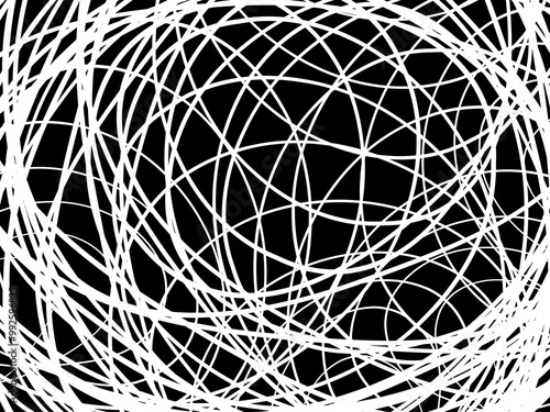 White tangled thread background. Circular abstract pen stroke vector illustration, on black background. Tangled scribbles hand drawn doodles. Vector illustration isolated on black background.