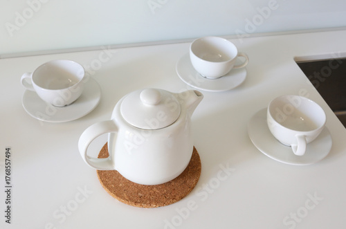 White teapot and cups on counter preparing herbal tea serving