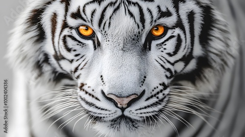 White tiger, white background, orange eyes, symmetrical composition, symmetrical close-up photo of face