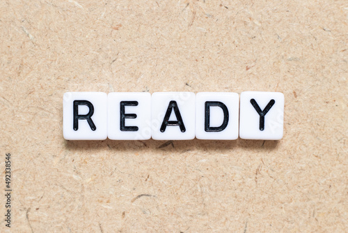 White tile alphabet letter with word ready on wood background