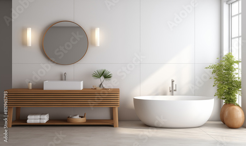 White tile bathroom interior with wooden cabinet, round mirror and white bathtub near window. Modern minimalistic style home decor