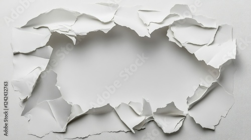 White torn paper frame with ripped, jagged edges, creating an empty space in the center, realistic texture