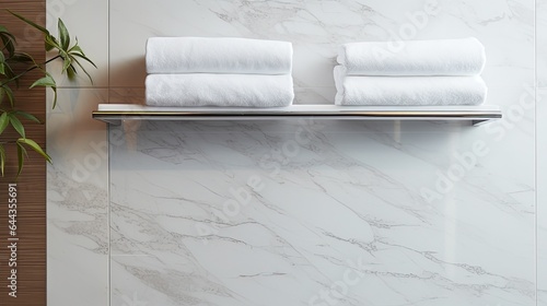 White towel hanging on the wall in bathroom with white marble tile wall. Bathroom interior