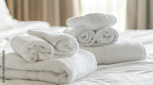 White towel on hotel bed Pile of soft bath towels Close up shot with room for text