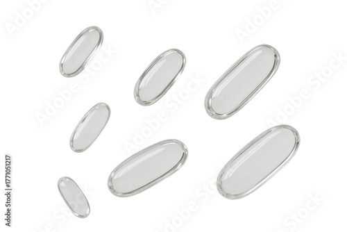 White transparent capsules falling, representing health, medicine, and clean ingredients on a transparent background