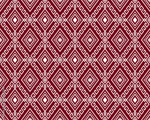 White Tribe or Ethnic Seamless Pattern on Red Background in Symmetry Rhombus Geometric Bohemian Style for Clothing or Apparel,Embroidery,Fabric,Package Design