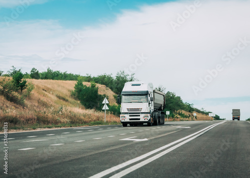 white truck with body is driving along asphalt road with markings to left of frame towards camera in clear weather across countryside