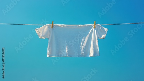 White T-shirt Hanging on Clothesline Under Bright Blue Sky with Natural Sunlight