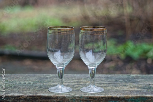 white two big glass crystal goblets on a gray wooden table outdoors