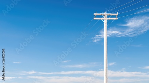White utility pole, clear blue sky, wispy clouds, rural landscape, energy infrastructure