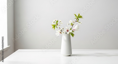 White Vase with Delicate White Blossoms and Green Leaves on a Wh