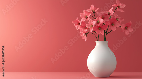 White vase with pink flowers on a light red background, 3D rendering. Simple floral
