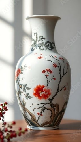 white vase with red flowers on a table