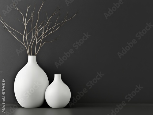 White Vases with Branches on Gray Wallpaper in Minimalist Interior Design