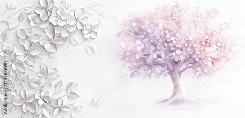 White wall featuring soft silver bas-relief flower patterns, with a large watercolor tree illustration in light pink and lilac tones, isolated on white.