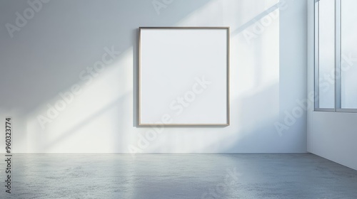 White wall with an empty frame in the center, providing a blank canvas for artistic expression or design.