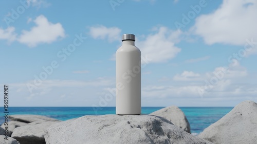 White Water Bottle on Coastal Rocks with Blue Ocean and Cloudy Sky Background