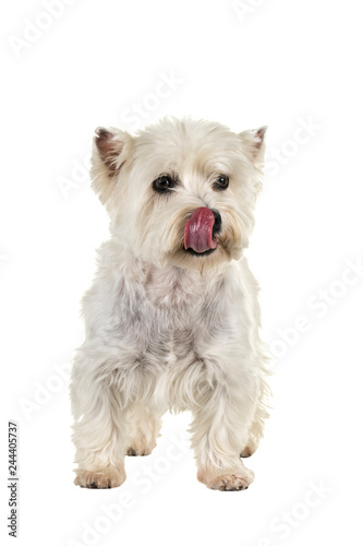 White West Highland Terrier Westie standing looking at camera licking her lips isolated on a white background