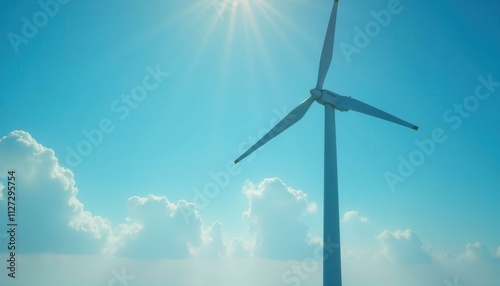 White Wind Turbine Against a Blue Sky and Fluffy Clouds Clean Energy Concept