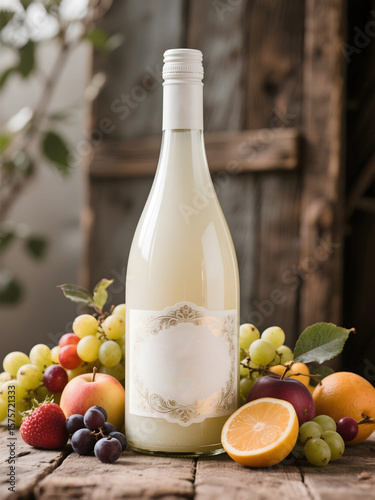 White Wine Bottle Surrounded by Mixed Fresh Fruits on Rustic Table