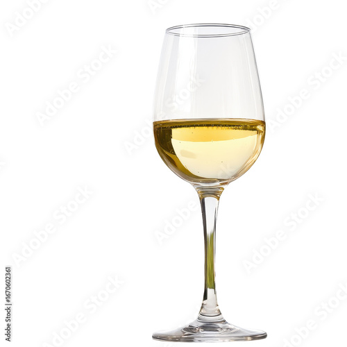 White wine glass on table view of wine farm daylight, glass of white wine on a table, isolated on transparent background