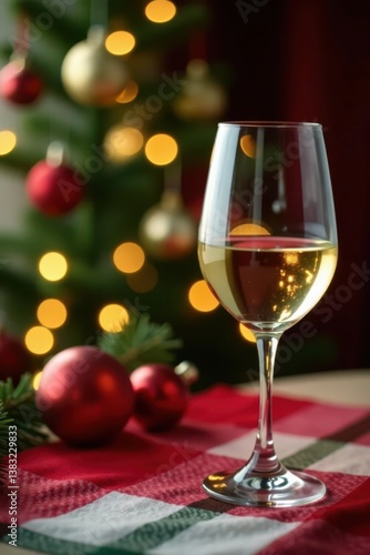 White wine glass rests on festive table, Christmas tree backdrop , decoration, background