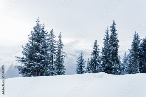 White winter landscape with snow, snow-covered trees and foggy mountains in Austrian Alps
