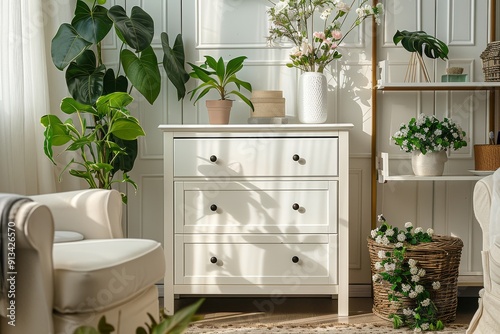White wooden bathroom cabinet with three drawers and two door cabinets in a spacious, modern living room with light-colored walls, plants, and warm decor, professionally photographed in high resolutio