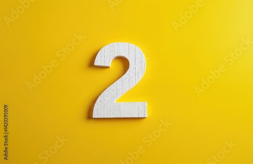 White wooden number two on vibrant yellow background. Digit symbol isolated. Sign for sale, discount, business, education, anniversary. Conceptual image for design projects, advertising, creative