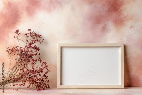White Wooden Picture Frame Mockup on Wall with Dried Flowers and Beige Textured Paper