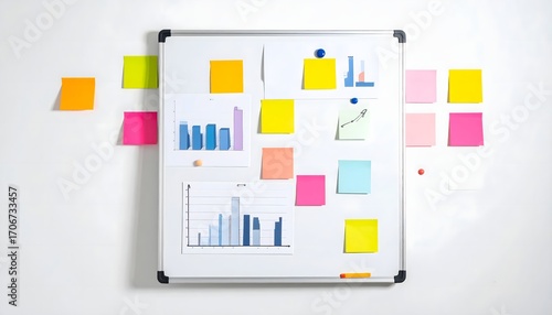 Whiteboard displaying colorful sticky notes and business charts affixed to its surface in an office setting, representing planning and organization with a creative vibe.