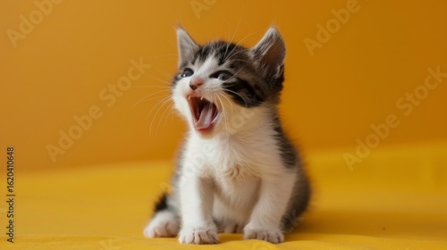 White-patched kitten playing on yellow background, joyful expression, stock photo style