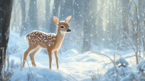 White-Tailed Fawn in Snowy Winter Forest