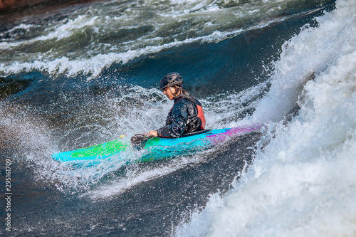 Whitewater kayaking, extreme sport rafting. Guy in kayak sails mountain river