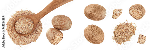 Whole and grated nutmeg in wooden spoon isolated on white background with full depth of field. Top view. Flat lay