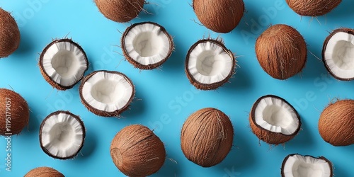 Whole and halved coconuts scattered on a vibrant blue background, showcasing their textured brown shells and creamy white interior from a top view.