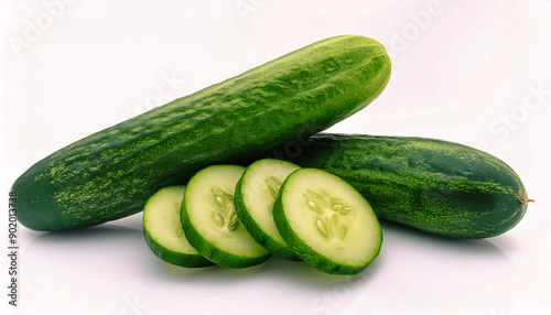 Whole and sliced cucumbers are still fresh and ready to be harvested isolated on white background.