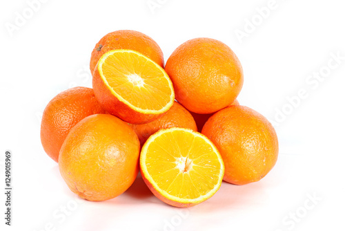 Whole and sliced oranges isolated on a white background
