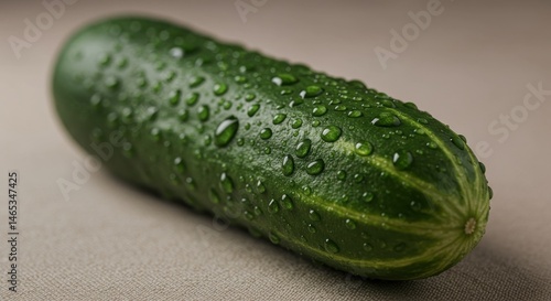 Whole cucumber with water drops on light fabric, close-up view, focus on texture