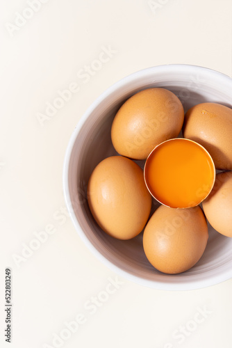 Whole eggs, egg yolk, and one broken isolated on a white background. Top view. Place for text.