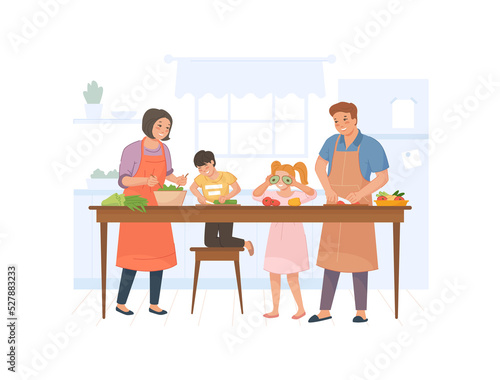 Whole family prepares salad. Cooking together, cook food healthy at kitchen, eating dinner, home vegetable meal, eat at culinary table, vector illustration